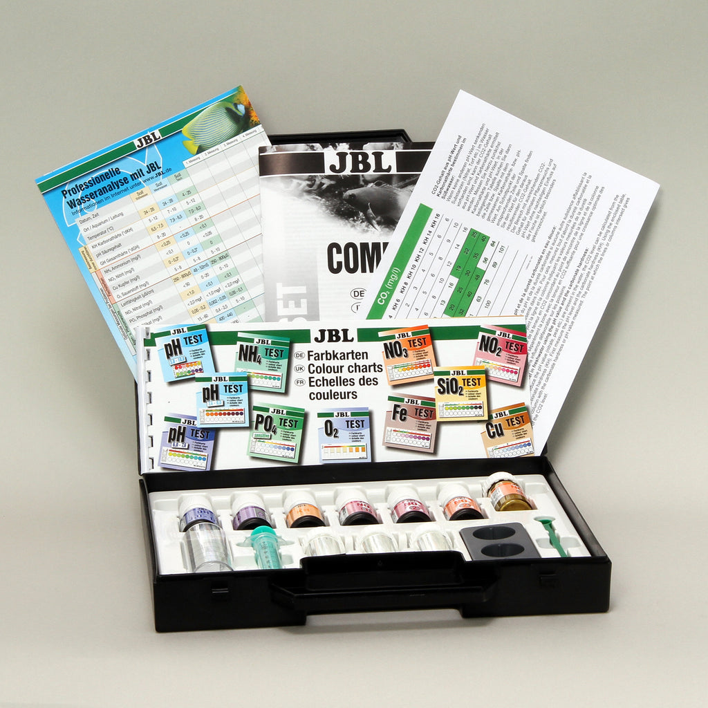 Incluído: 1 mala de teste para aquários plantados. 5 reagentes, 3 cuvetes de vidro, seringa, colher doseadora, bloco comparador, cuvete de plástico, paletas de cores, folhas de registo e manual de instruções