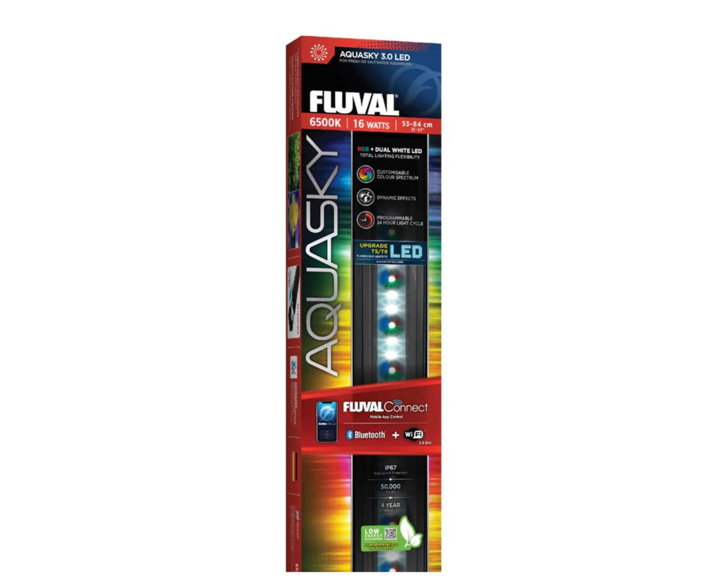 O Fluval Aquasky 3.0 LED é uma lâmpada LED inteligente, controlada por aplicações, concebida para aquários de 38 a 130 cm. Oferece personalização total da cor RGB + branco, simulação do ciclo solar e resistência IP67 para ambientes aquáticos exigentes. Caraterísticas Combinação de RGB + LEDs brancos duplos para criar espectros de cor totalmente personalizados. Clima dinâmico e efeitos especiais, como relâmpagos ou nuvens, para ambientes mais realistas. Ciclo de luz programável de 24 horas com fases de amanhecer, meio-dia, anoitecer e noite. Ecrã realista que reproduz a luz solar natural para tons vivos em peixes e plantas. Controlo exclusivo através da aplicação FluvalConnect (Bluetooth + Wi-Fi 2,4 GHz). Proteção IP67 avançada: resistente à água, à humidade e ao pó. Lente de vidro de alta qualidade para uma distribuição uniforme da luz e durabilidade. A estrutura em liga de alumínio dissipa o calor de forma eficiente, prolongando a vida útil do produto. Suportes extensíveis incluídos para se adaptarem a aquários de 38 a 130,4 cm. Clipes incluídos para montagem sob o convés ou adaptação de sistemas T5/T8. Concebida na Alemanha com engenharia de alta precisão. Ideal para aquários de água doce, plantados e marinhos (apenas peixes).