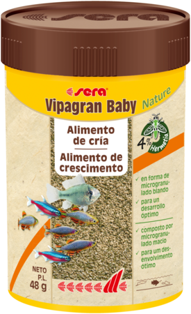 Microgranulado macio para animais jovens com 4 % de farinha de insetos sera Vipagran Baby Nature é o alimento de crescimento, sem corantes nem conservantes, composto por microgranulado macio cuidadosamente processado, para todos os peixes jovens que comem na zona média da água. A fórmula equilibrada, de fácil digestão, com farinha sustentável de peixe e insetos, ácidos gordos ómega, algas ricas em carotenoides e oligoelementos, assim como mananoligossacarídeos de efeito prebiótico, promove um crescimento saudável, um sistema imunitário forte, assim como um desenvolvimento e uma coloração ótimos. O microgranulado macio, que se afunda lentamente, amolece rapidamente, mas mantém a sua forma e não polui a água.