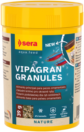 sera Vipagran Nature é o alimento base, composto por granulado macio, cuidadosamente processado, sem corantes e conservantes, indicado para todos os peixes que comem na zona média da água.