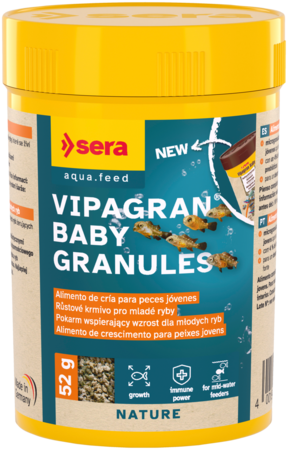 sera Vipagran Baby Nature é o alimento de crescimento, sem corantes nem conservantes, composto por microgranulado macio cuidadosamente processado, para todos os peixes jovens que comem na zona média da água.