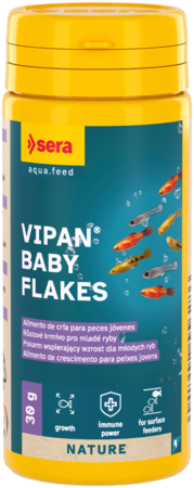 sera Vipan Baby Nature é o alimento de crescimento sem corantes nem conservantes, composto por microflocos cuidadosamente processados, para todos os peixes jovens que se alimentam na superfície da água.